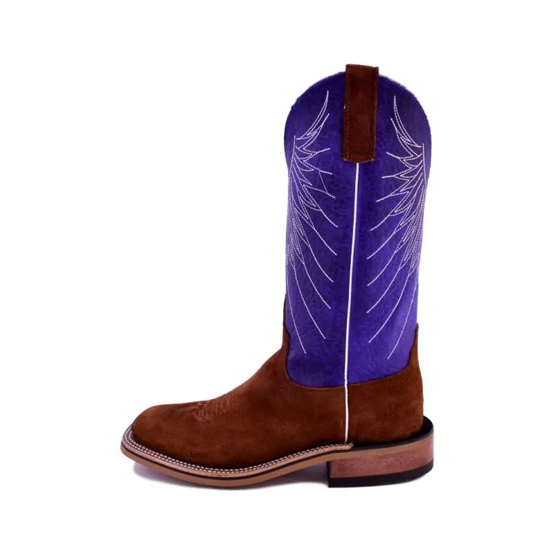 Vamp: Brown Mule | Top: Purple Bison | Color: Rust/Purple | Top Height: 13″ | Toe: DB | Heel: AB | Sole: Oxbow w/ Neoprene Midsole w/ Cush-N-Sole | Proudly made in the USA