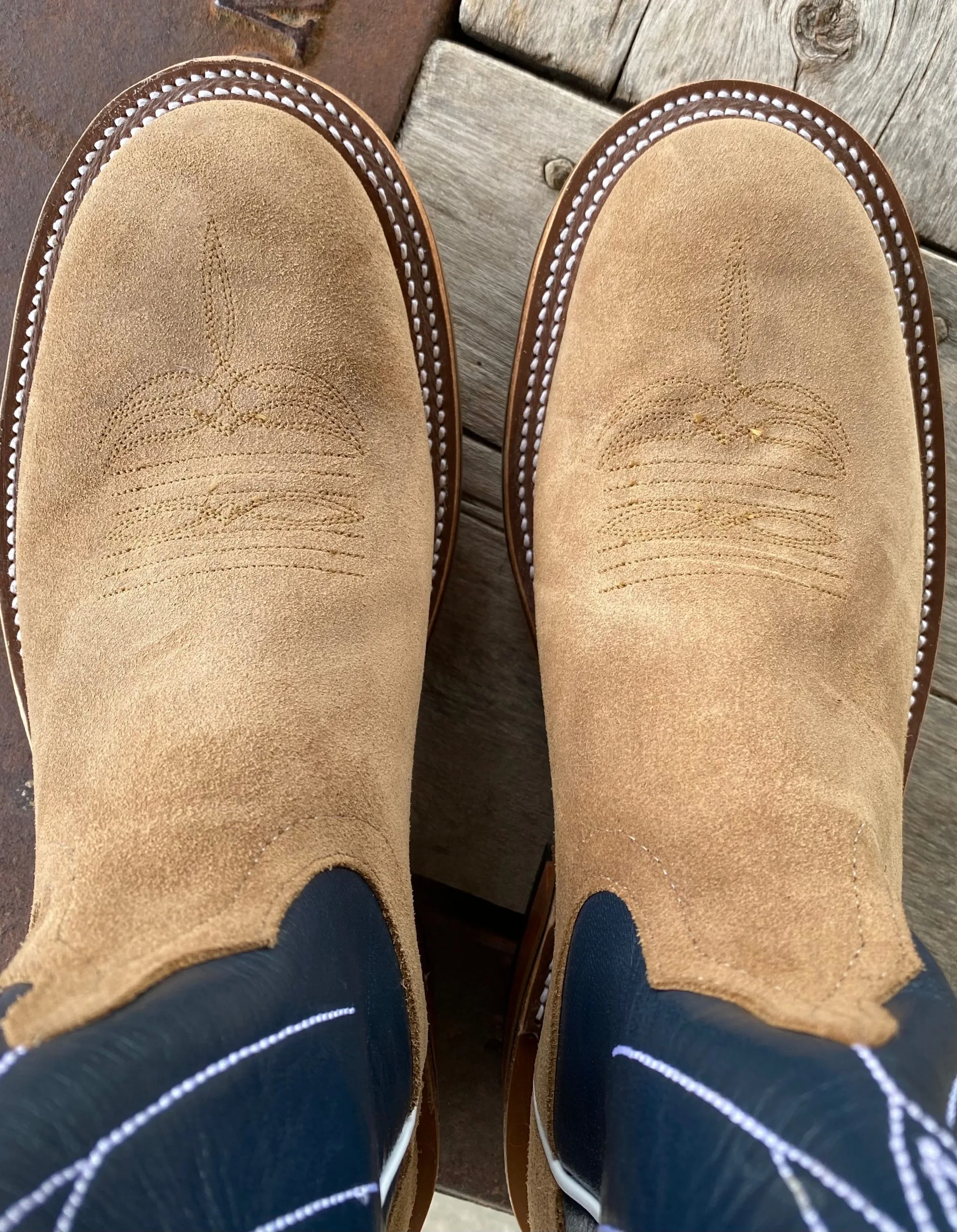 Vamp: Tan Newman Roughout | Top: Regal Blue Kidskin | Color: Tan/Blue | Top Height: 13″ | Toe: Roper | Sole: Oxbow w/ Neoprene Midsole w/ Cush-N-Sole | Proudly made in the USA |