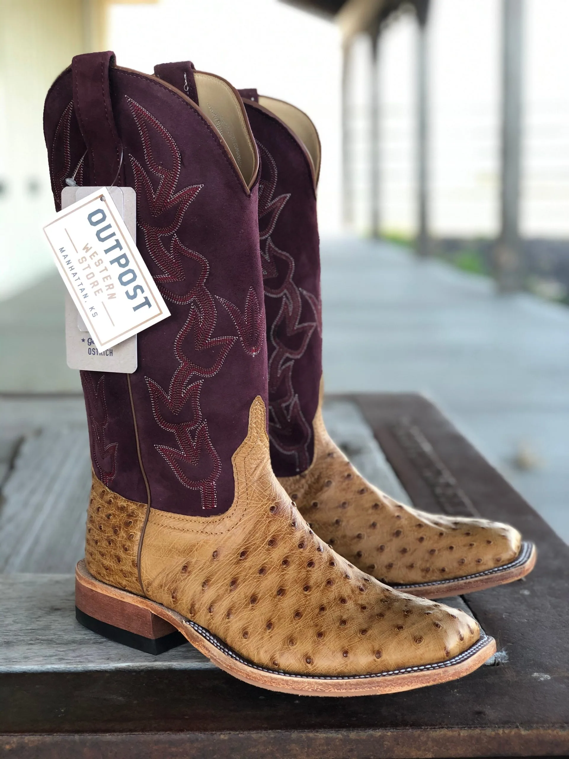 Vamp: Umber Bruciato Full Quill Ostrich | Top: Matador Suede Kidskin | Color: Tan/Burgundy | Top Height: 13″ | Toe: DB | Sole: Hybrid w/Cush-N-Sole | Proudly made in the USA |