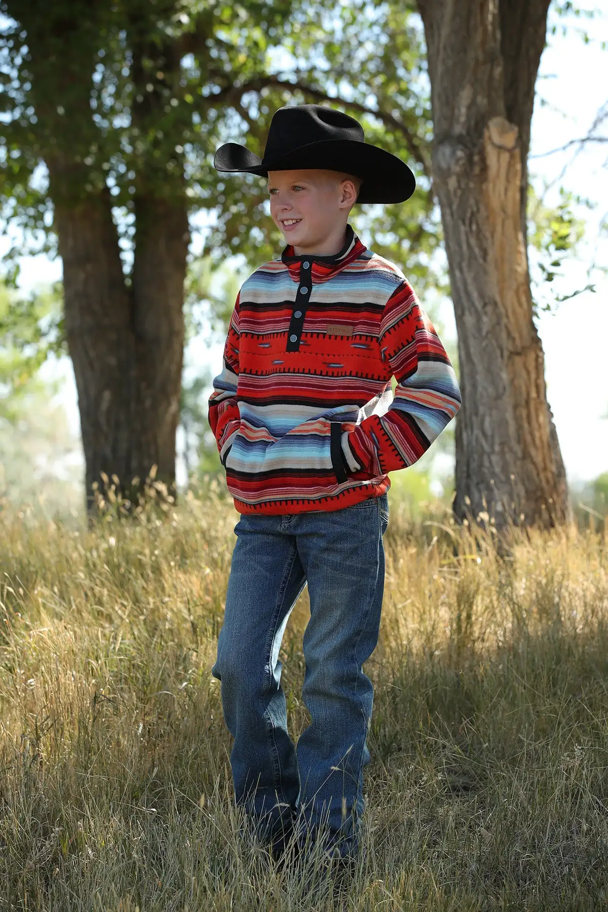 Bright orange, cool blue, burgundy, black stripes with black trim, make this a standout comfortable fleece choice for your young cowboy.