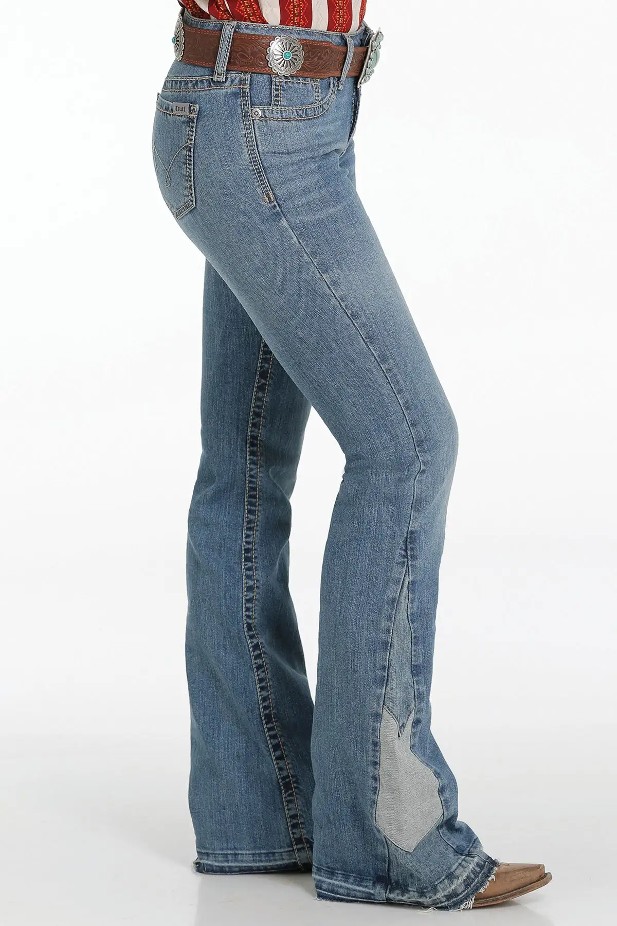Our best-selling moderate-rise is back and better than ever! 22″ flare legs with reverse denim chevron shaped piecing give HANNAH an all-new, yet vintage look at the same time. Tint, hand sanding, whiskers, knee starbursts and a released bottom hem highlight an 11 oz. light stonewashed stretch denim.