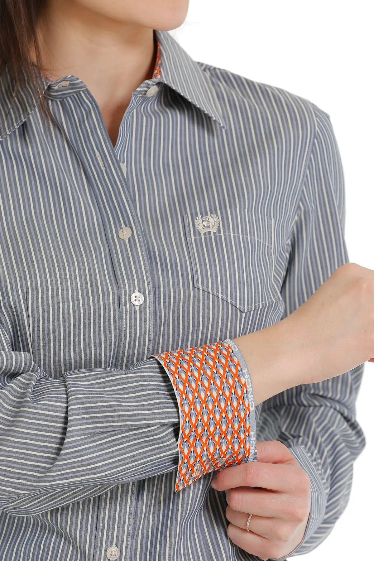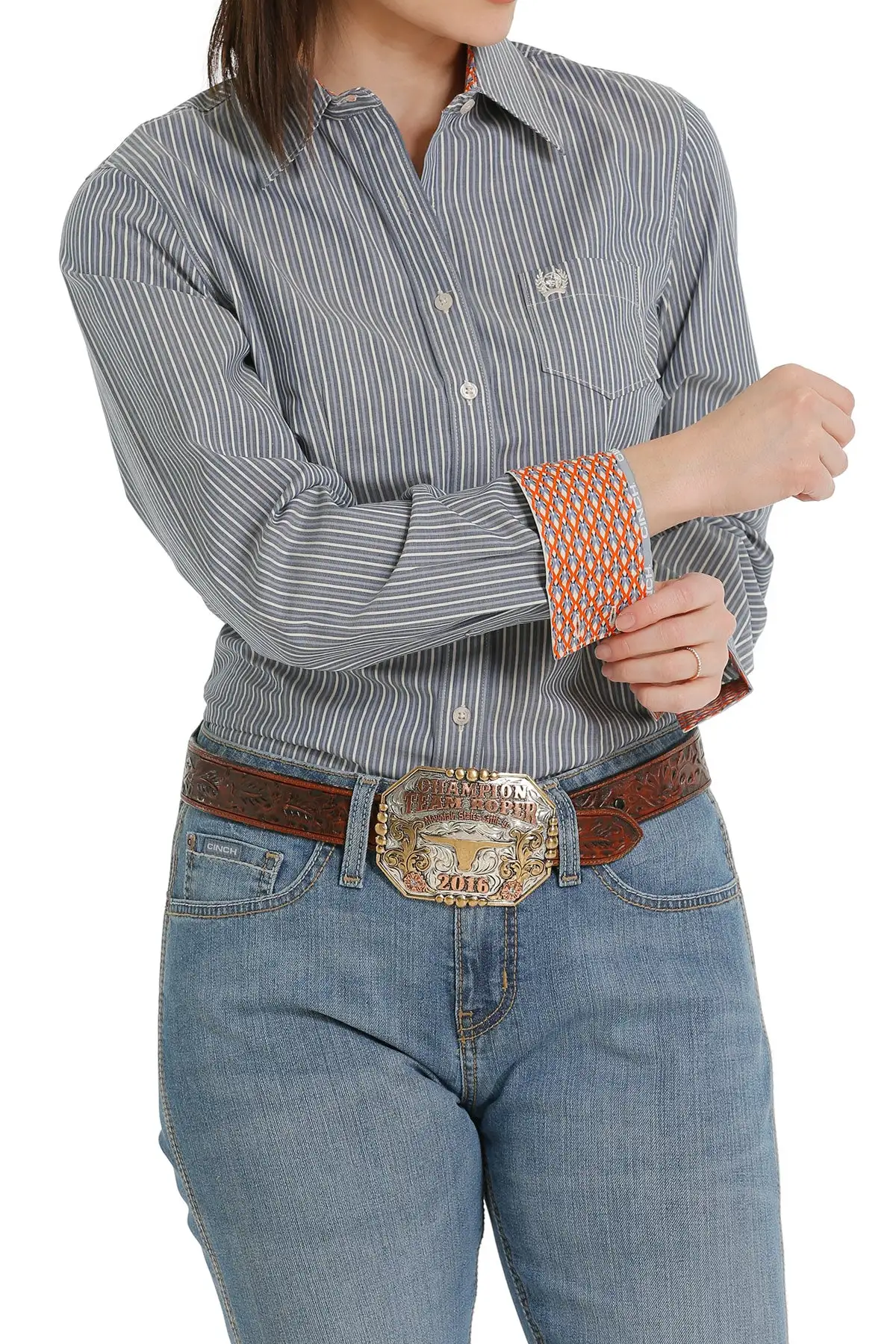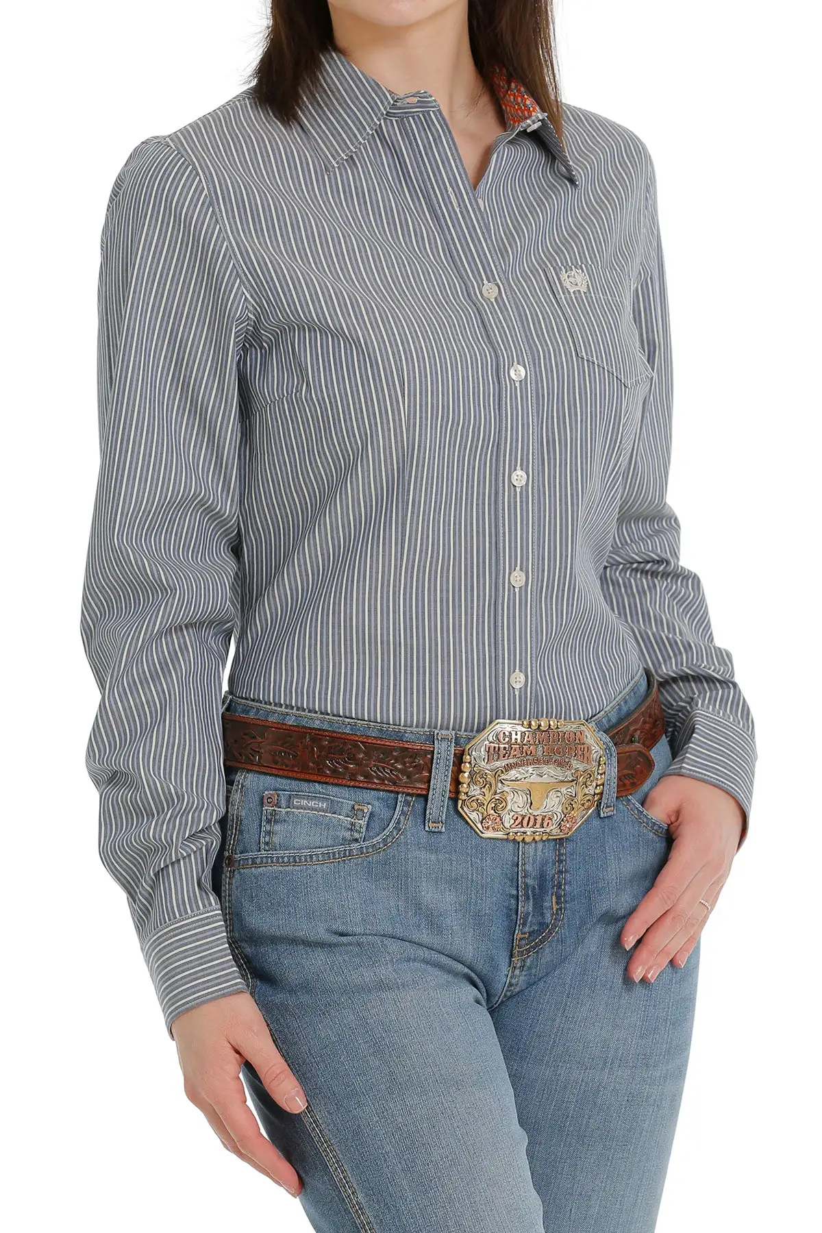 Stand out with style at the arena or evening out on the town with this tailored feminine fit long sleeve, button-down shirt.