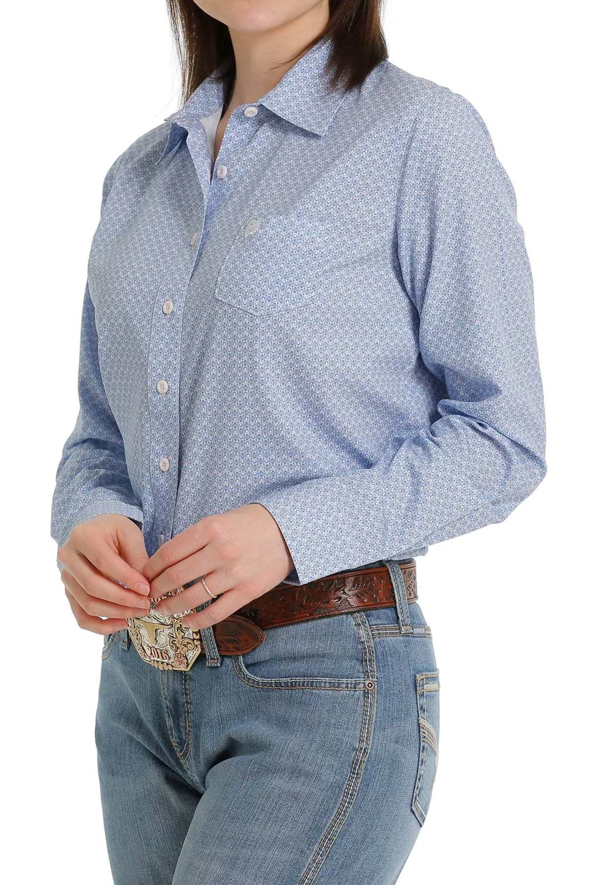 Stand out with style at the arena or evening out on the town with this tailored feminine fit long sleeve, button-down shirt.