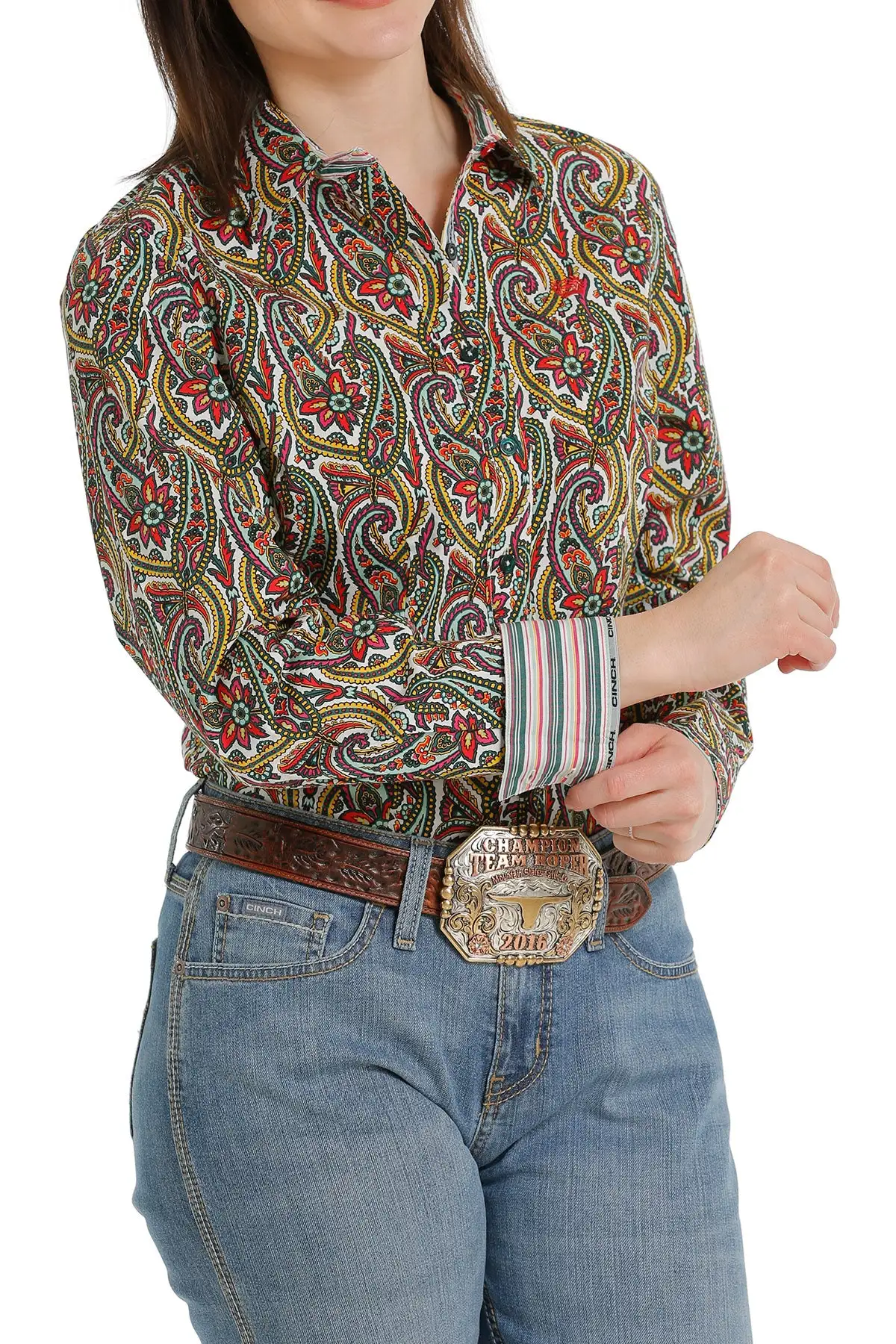 Bold hints of paisley and western leather tooling combined pattern along with a color explosion of poinsettia red, citrus yellow, bayberry, soft blue-green, and fuchsia rose, make this Cinch ladies long-sleeve a standout choice for the arena or any outing.