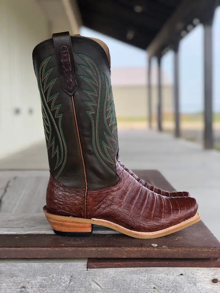 Vamp: Chasi Brown Belly Caiman | Top: Pamero | Color: Chocolate/Dark Olive | Top Height: 13″ | Toe: #0 | Heel: C Long | Sole: Tan Ranch Tough | Proudly made in the USA |