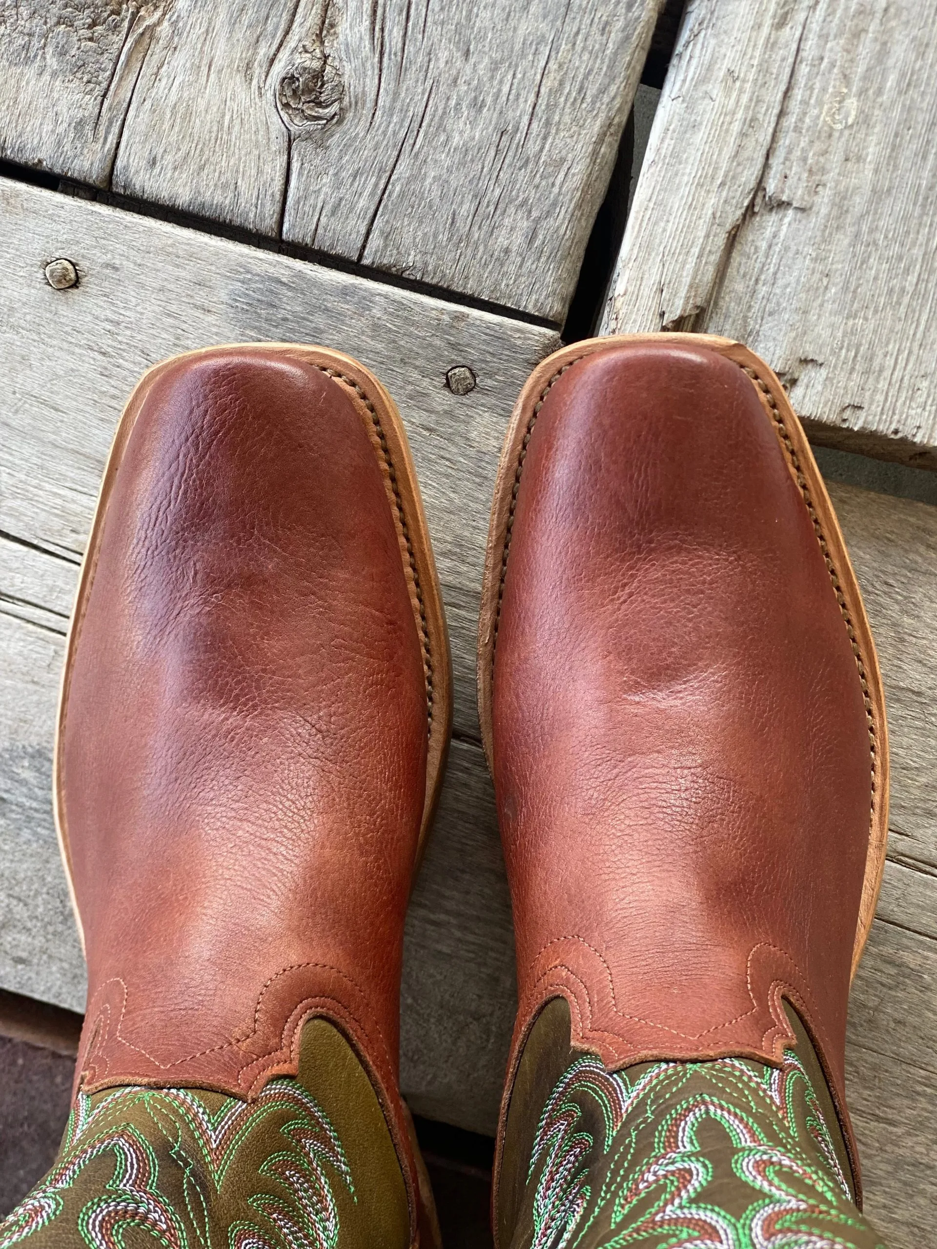 Vamp: Chili | Top: Olive Arizona | Color: Brown/Green | Top Height: 12″ | Toe: 0 | Heel: D Long | Sole: Ranch Tough | Proudly made in the USA |