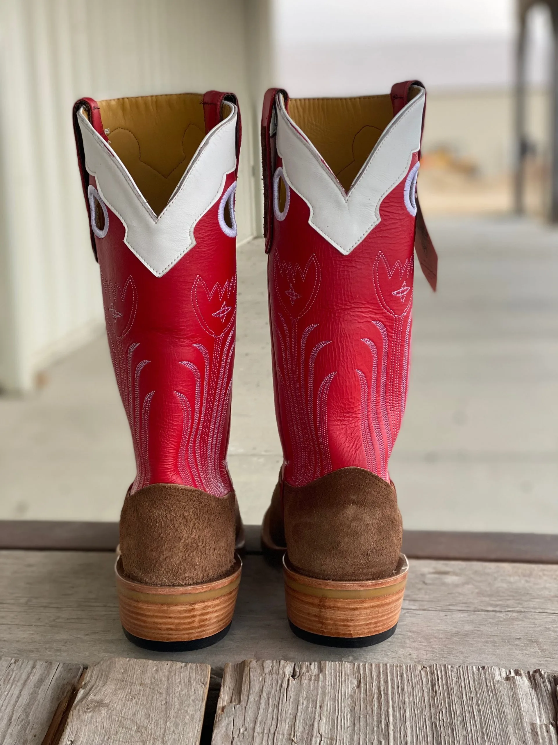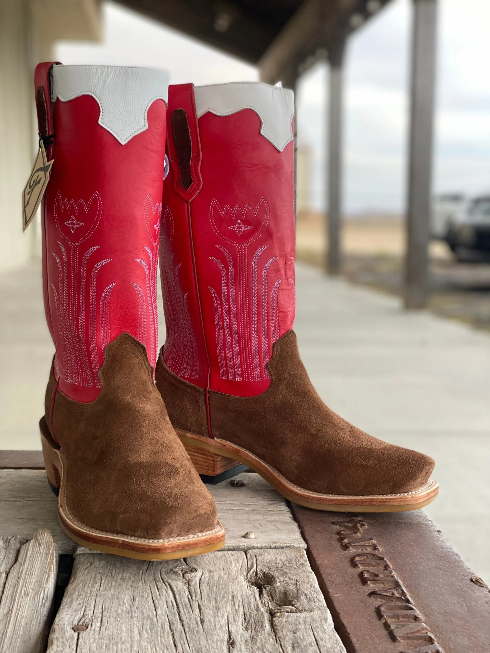 Vamp: Chocolate Cape Buffalo Roughout | Top: Red S Series | Collar: White Damian O Color: Chocolate/Red | Top Height: 13″ | Toe: 0 Toe | Heel: C Long | Sole: Ranch Tough w/ Leather Midsole | Proudly made in the USA |
