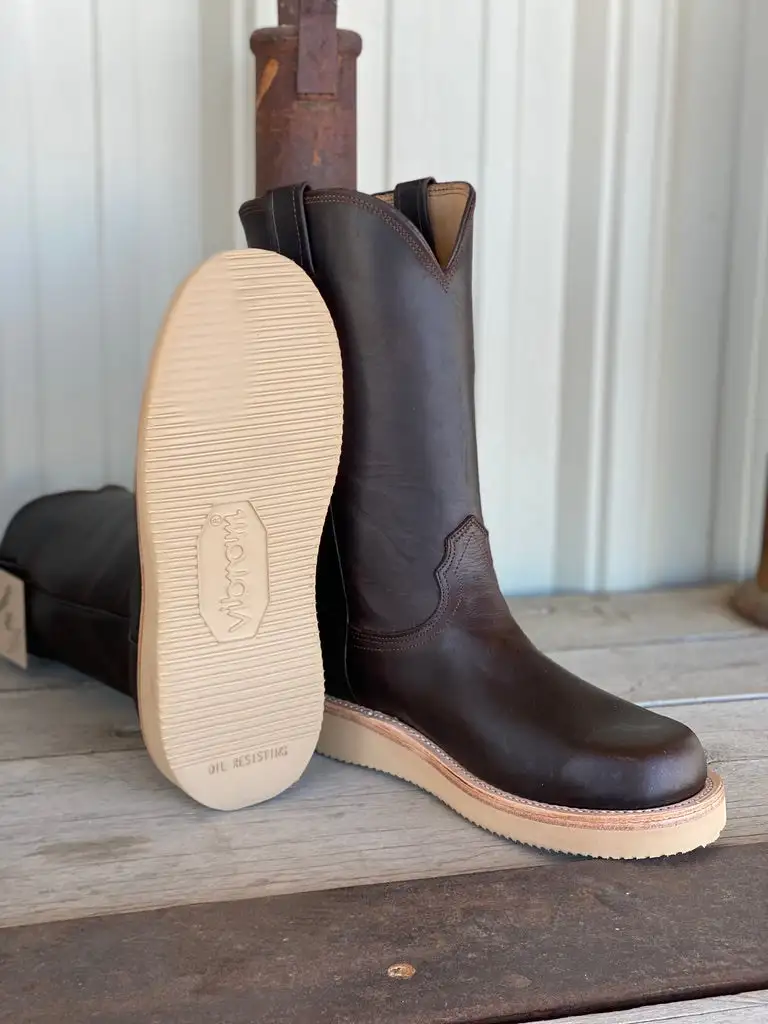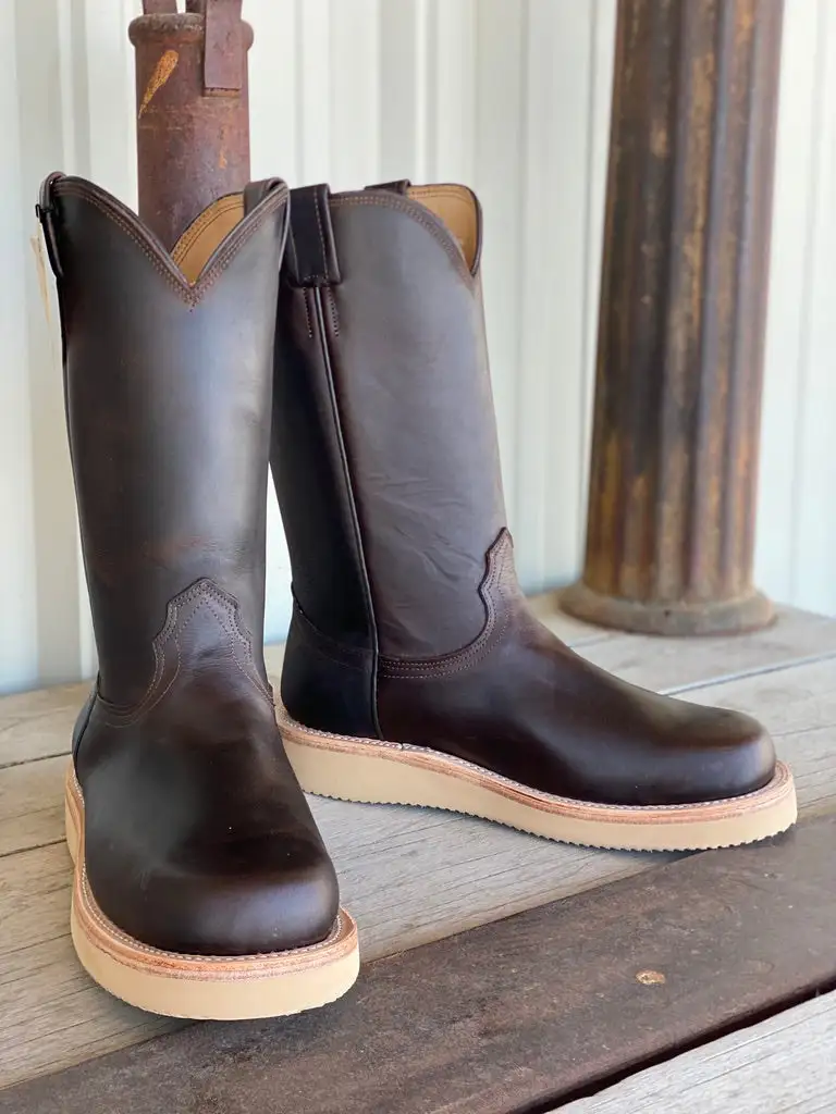 Vamp:Ā ChocolateĀ Fuji | Top:Ā Chocolate FujiĀ | Color:Ā ChocolateĀ | Top Height: 13″ | Toe:Ā Roper ToeĀ | Sole: Vibram Crepe Work Wedge | Proudly made in the USA |