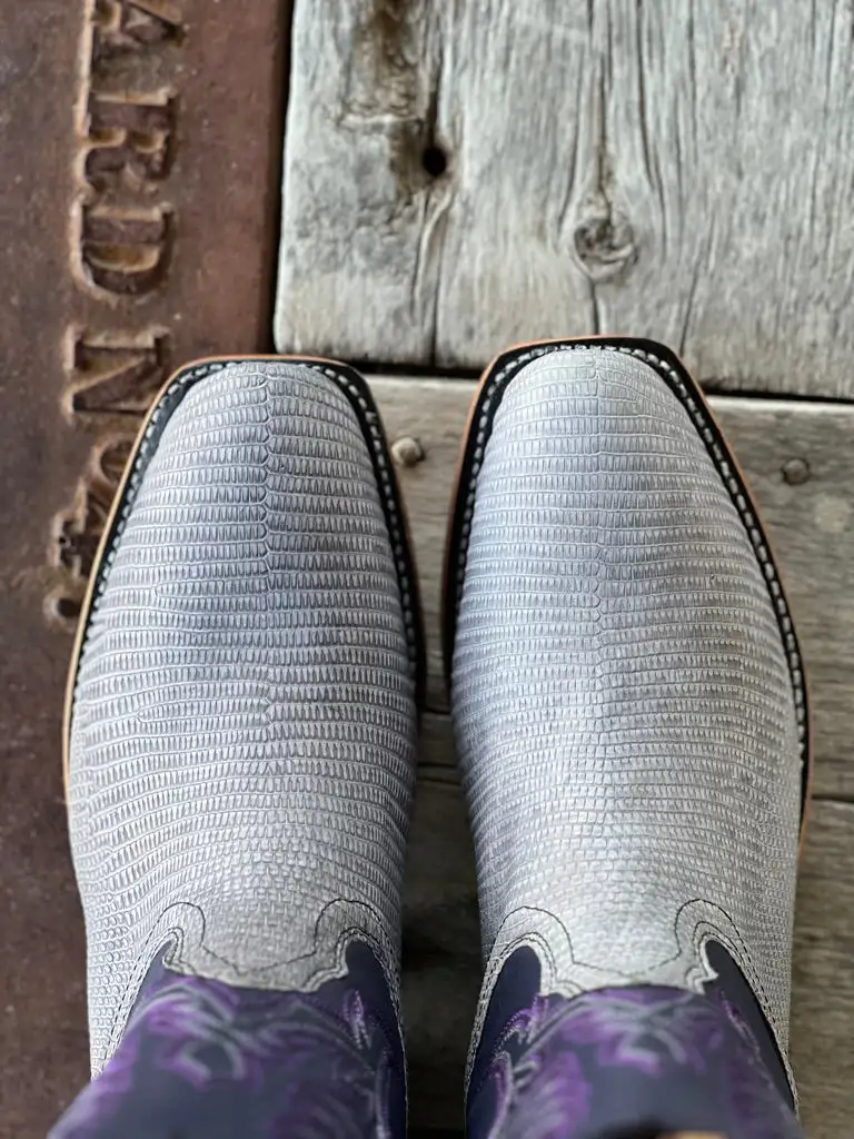 Vamp: Grey Vintage Lizard | Top: Purple S Series | Color: Grey/Purple | Top Height: 11” | Toe: #1 | Heel: C Long | Sole: Tan Ranch Tough | Proudly made in the USA |