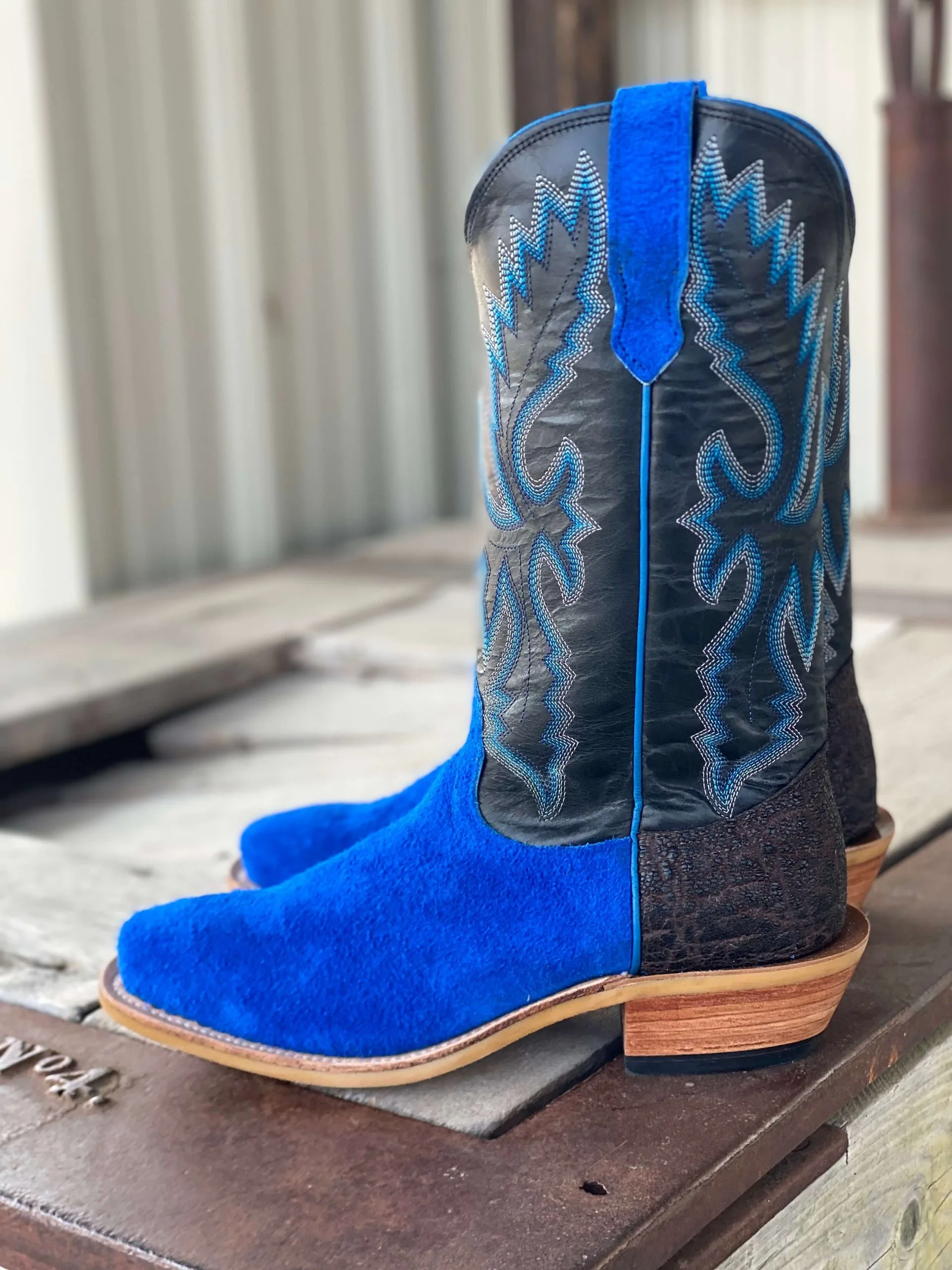 Vamp: Ocean Blue Roughout w/ Elephant Counter | Top: Black Kidskin | Color: Blue/Black | Height: 13″ | Toe: #1 | Heel: C | Sole: Ranch Tough | Proudly made in the USA |