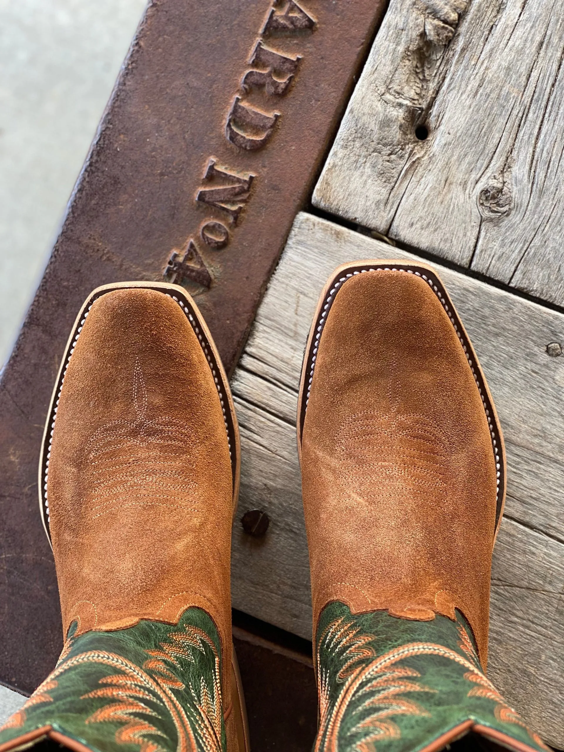 Vamp: Camel Suede | Top: Emerald Explosion | Color: Brown/ Green| Top Height: 13″ | Toe: TK | Sole: Hybrid