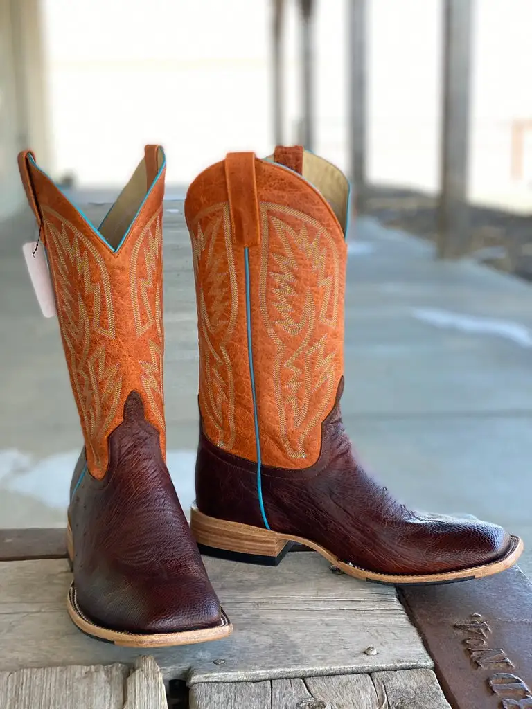 Vamp: Sienna Lux Smooth Ostrich | Top: Orange Sinsation | Color: Brown/Orange | Top Height: 13″ | Toe: DB | Sole: Hybrid
