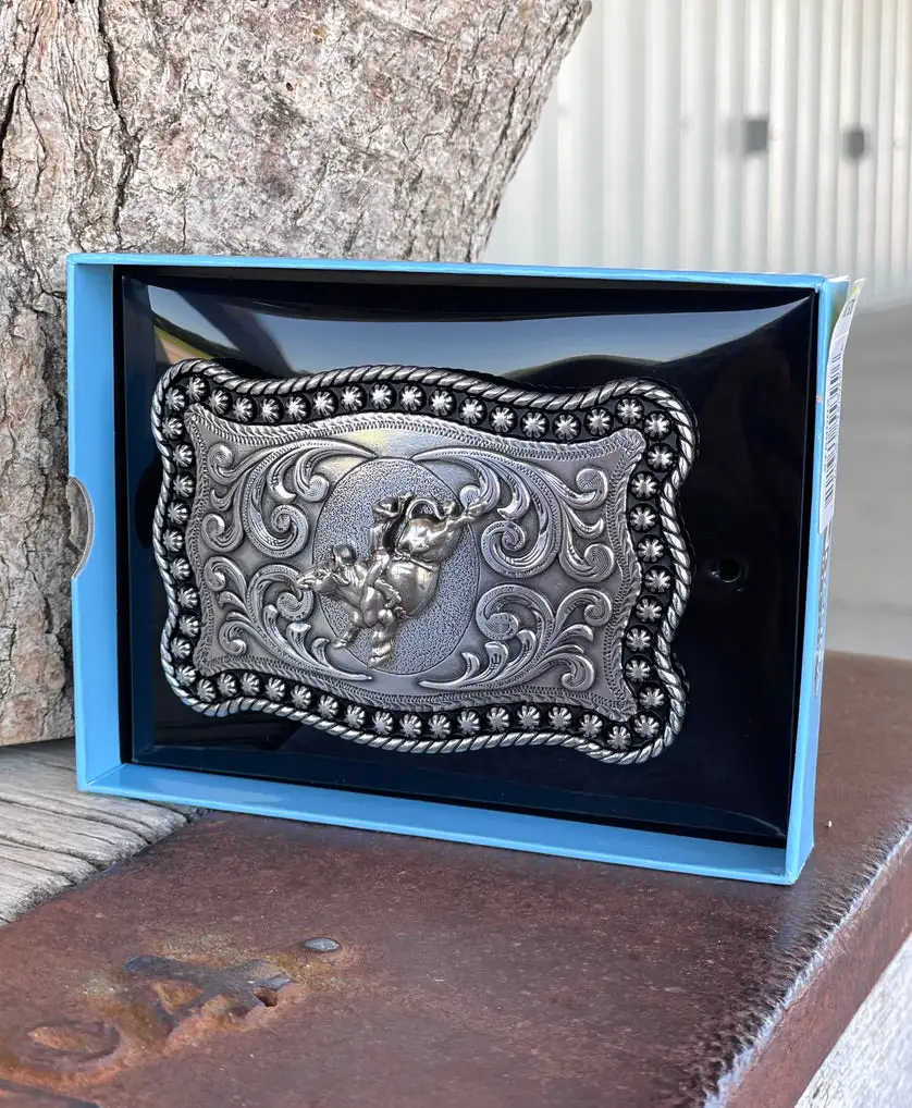 Bullrider buckle with floral pattern surrounding and rope and berry edge.