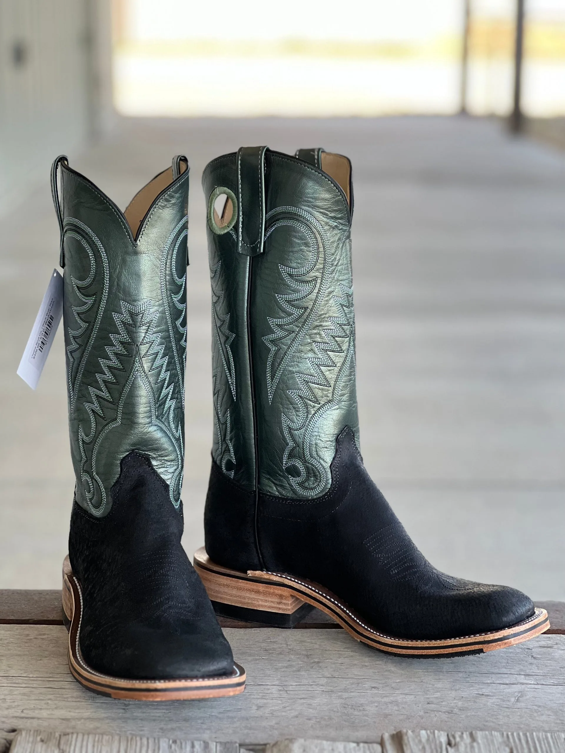 Vamp:Â Black Boar | Top:Â Green Velvet Luster Kidskin | Color:Â Black/Green | Top Height: 13″ | Toe: WS | Heel:Â TP | Sole:Â Hybrid w/ Neoprene Midsole w/ Cush-N-Sole | Proudly made in the USA |