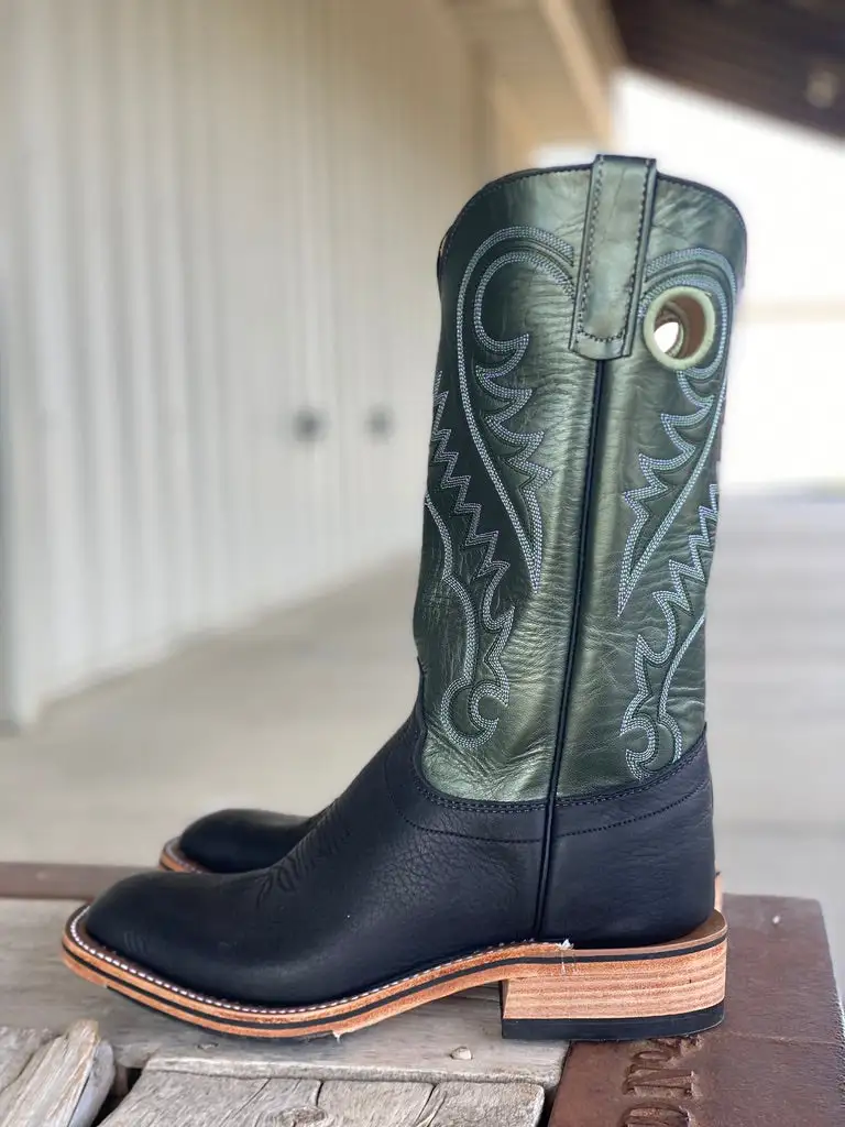 Vamp:Â Black Mule Leather | Top:Â Green Velvet Luster Kidskin | Color:Â Black/Green | Top Height: 13″ | Toe: WS | Heel:Â TP | Sole:Â Hybrid w/ Neoprene Midsole w/ Cush-N-Sole | Proudly made in the USA |