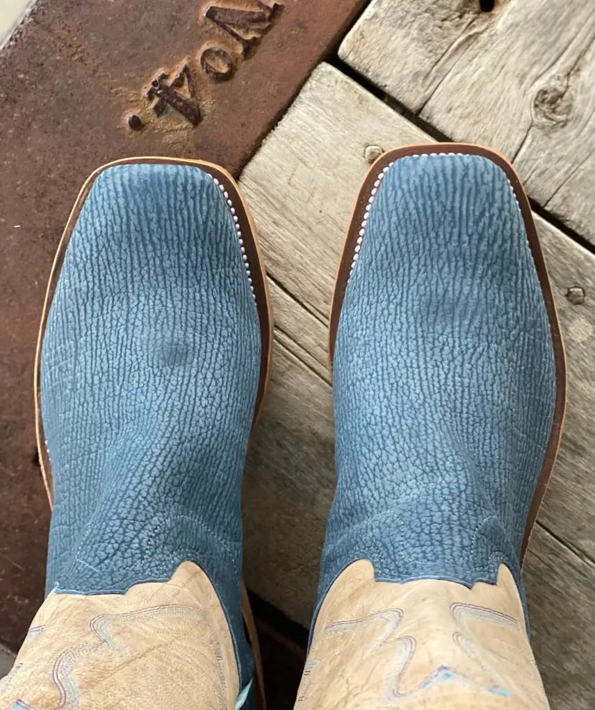 Vamp: Blue Safari Shark | Top: Ivory Mad Dog | Color: Blue/Ivory | Top Height: 16″ | Toe: Cutter | Heel: 1 1/2″L | Sole: Oxbow w/ Neoprene Midsole and Cush-N-Sole | Proudly made in the USAÂ