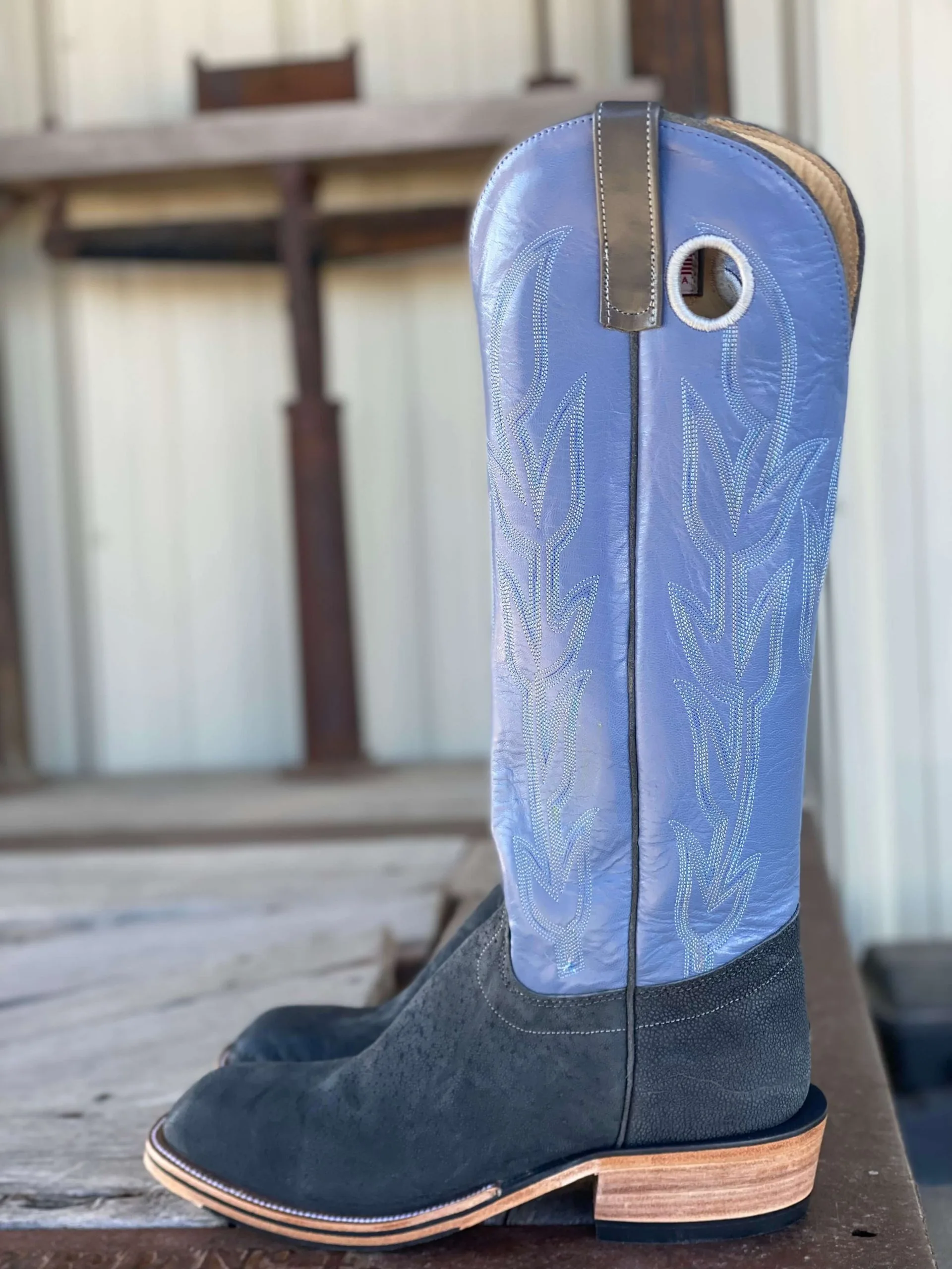 Vamp: Dark Grey Buffed Elephant| Top: Bellflower Kidskin | Color: Dark Grey/Blue | Top Height: 16″ | Toe: SY | Heel: 1 1/2″L | Sole: Hybrid w/ Neoprene Midsole w/ Cush-N-Sole| Proudly made in the USAÂ