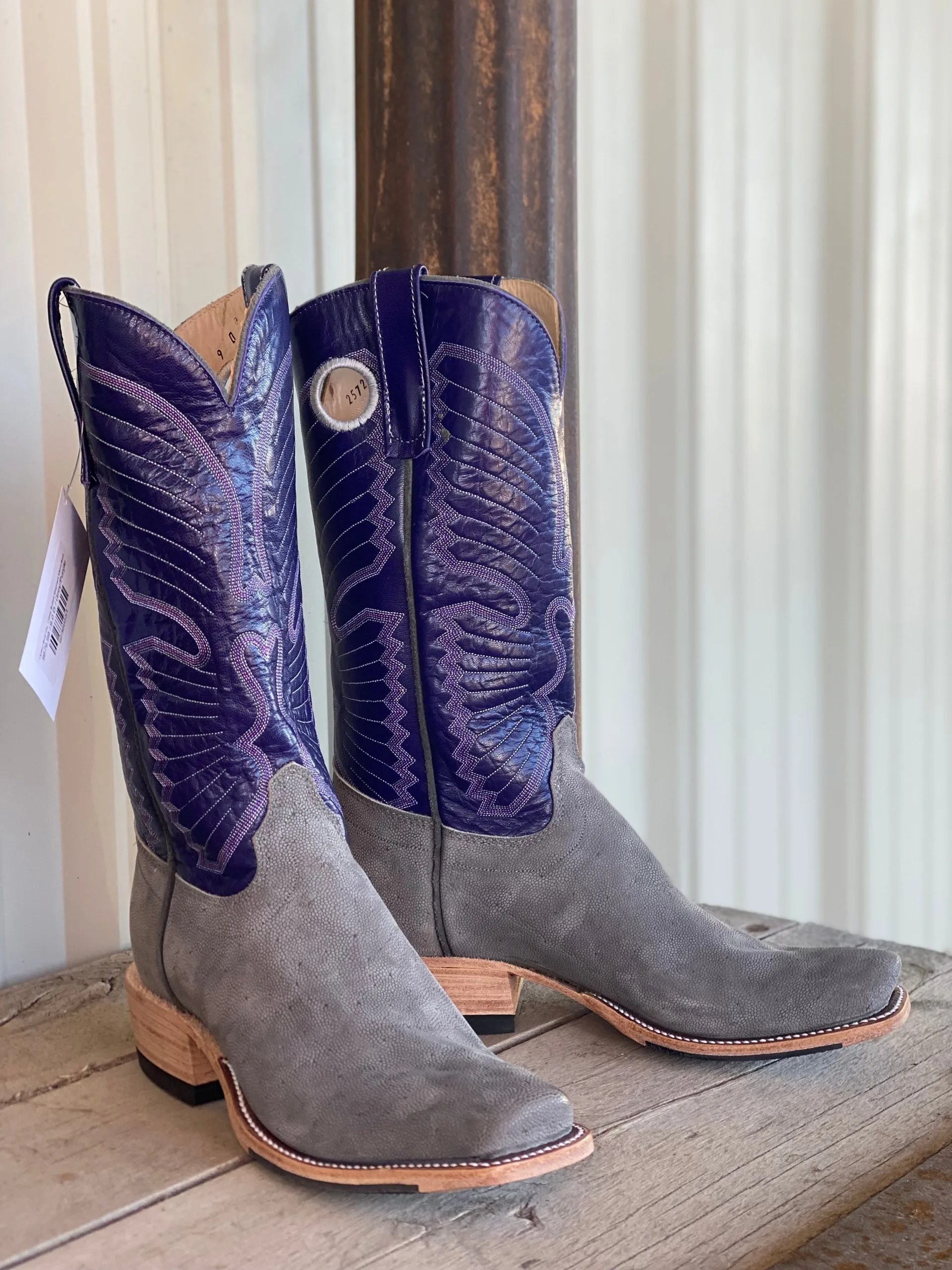 Vamp: Grey Buffed Elephant | Top: 13″ | Color: Grey/Purple | Top Height: 13″ | Toe: O | Heel:Â 1 5/8″P | Sole:Â Hybird | Proudly made in the USAÂ