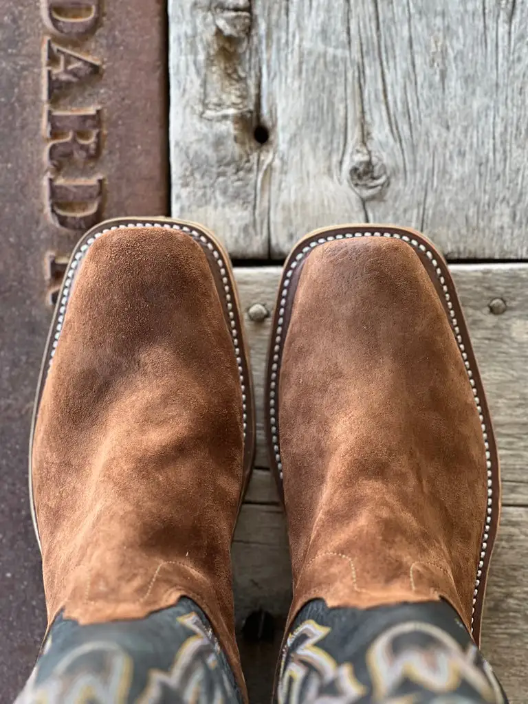 Vamp: Latte & Bacon Sueded Boar Hide | Top: Blue Navajo Bison | Color: Brown/Navy | Top Height: 13″ | Toe: Cutter |Â Heel: 1 1/2″ | Sole: Oxbow w/ Neoprene Midsole w/ Cush-N-Sole | Proudly made in the USA |