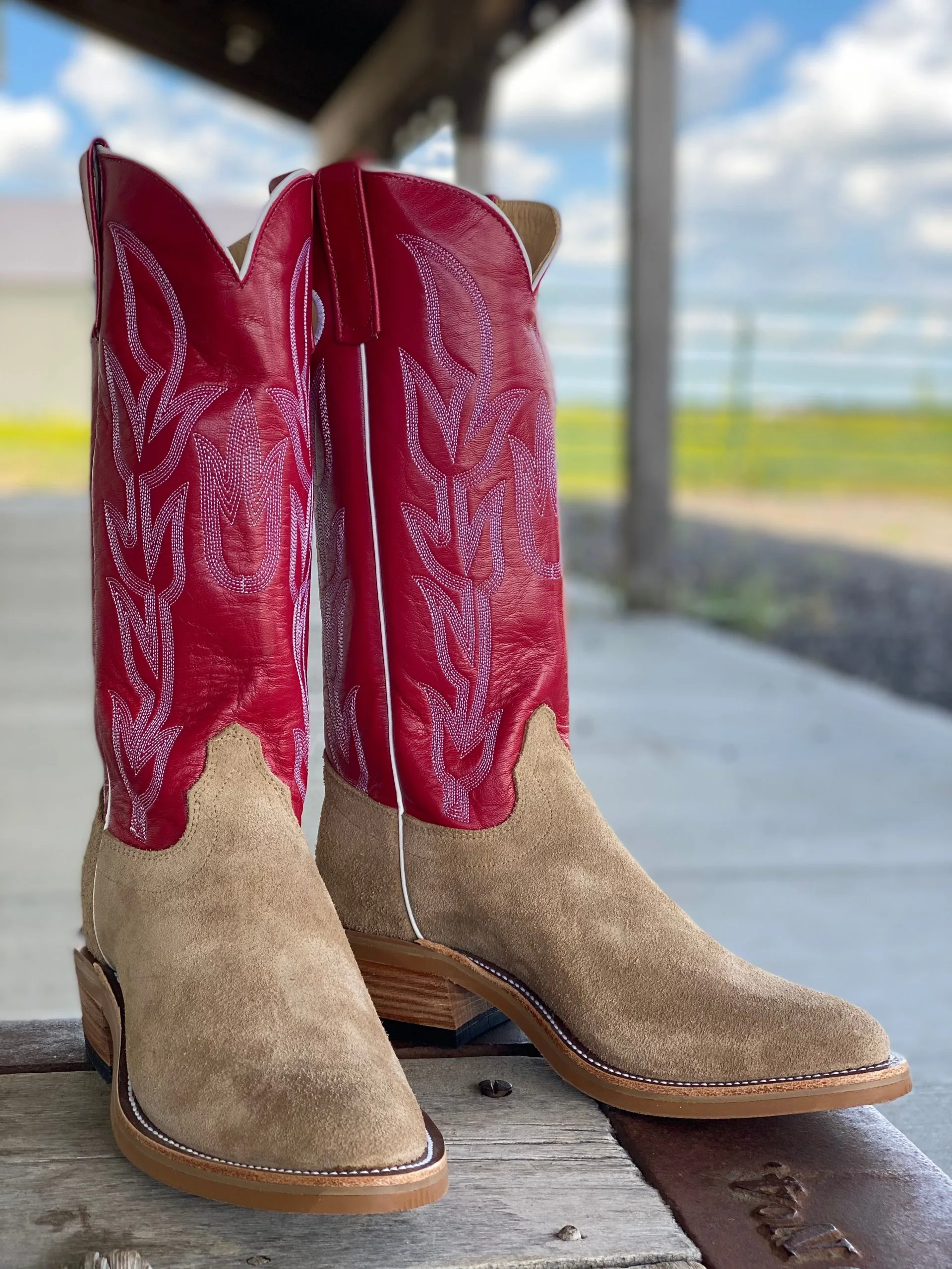Vamp: Mesquite Beeswax Roughout | Top: Tristan Kidskin | Color: Tan/Red | Top Height: 14″ | Toe: J | Heel: 4 Sole: Oxbow w/ Neoprene Midsole | Cush-N-Sole | Proudly made in the USA |