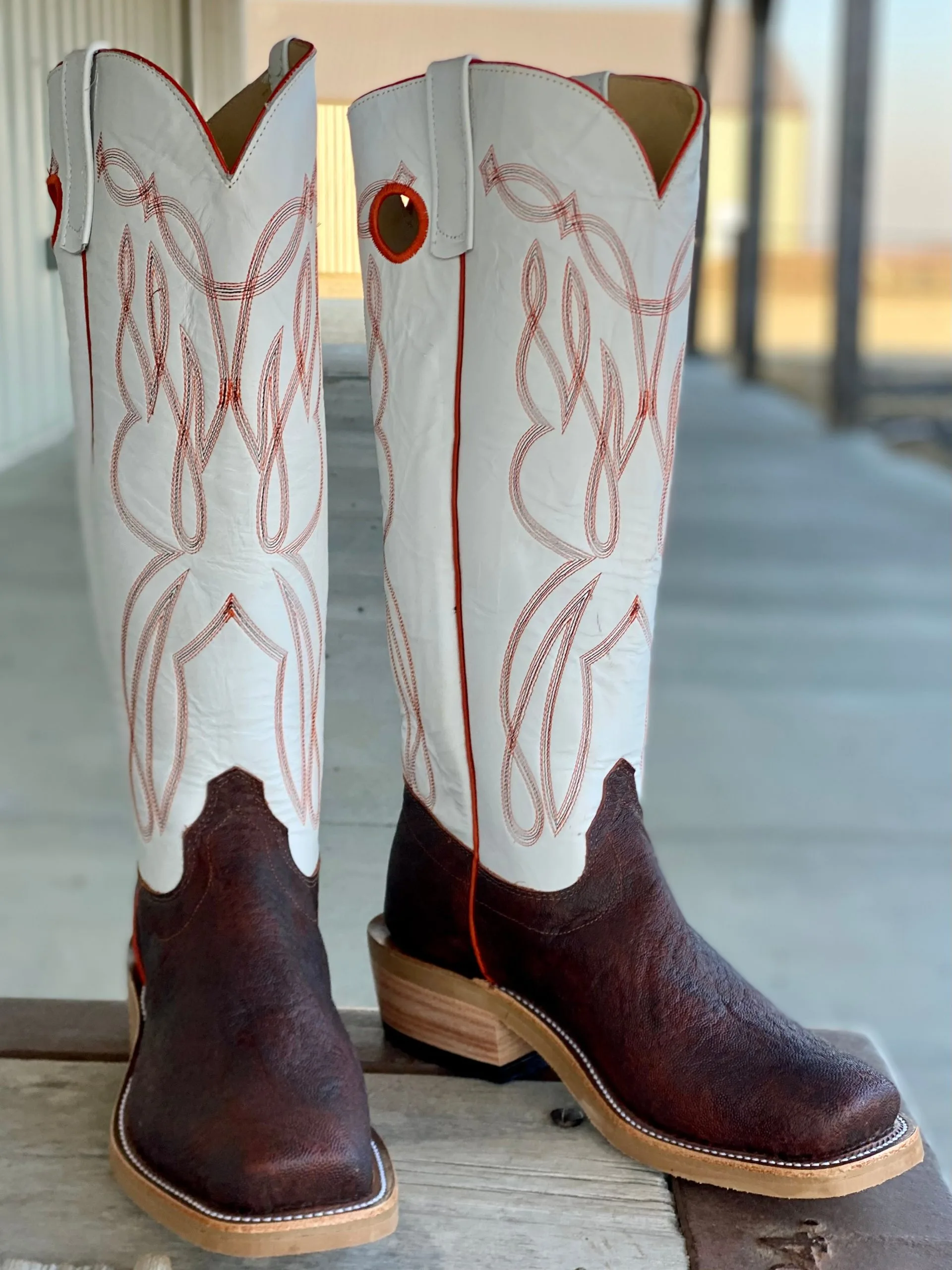 Vamp: Rust Elephant Ear | Top: White Glove | Color: Rust/White | Top Height: 16″ | Toe:Â Cutter | Heel: 1 1/2″ | Sole:Â Oxbow w/ Tan Neoprene Midsole and Cush-N-Sole | Proudly made in the USA |