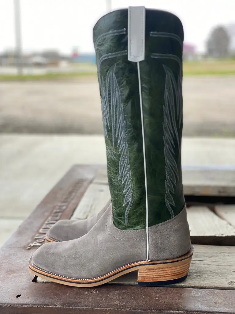 Vamp: Smoked Bacon | Top: Emerald Explosion | Color: Grey/Green | Top Height: 17″ | Toe: SY | Heel: 4 | Sole: Oxbow w/ Neoprene Midsole w/ Cush-N-Sole | Proudly made in the USA |