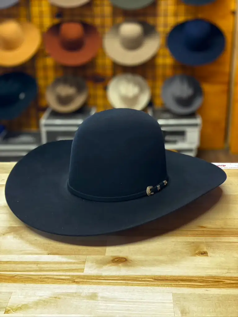 Rodeo King | Black 30X Felt Cowboy Hat | Crown: Open | Brim: 4 1/2″, Flat | Long Oval | Self band and buckle set | Genuine Leather Sweat Band |