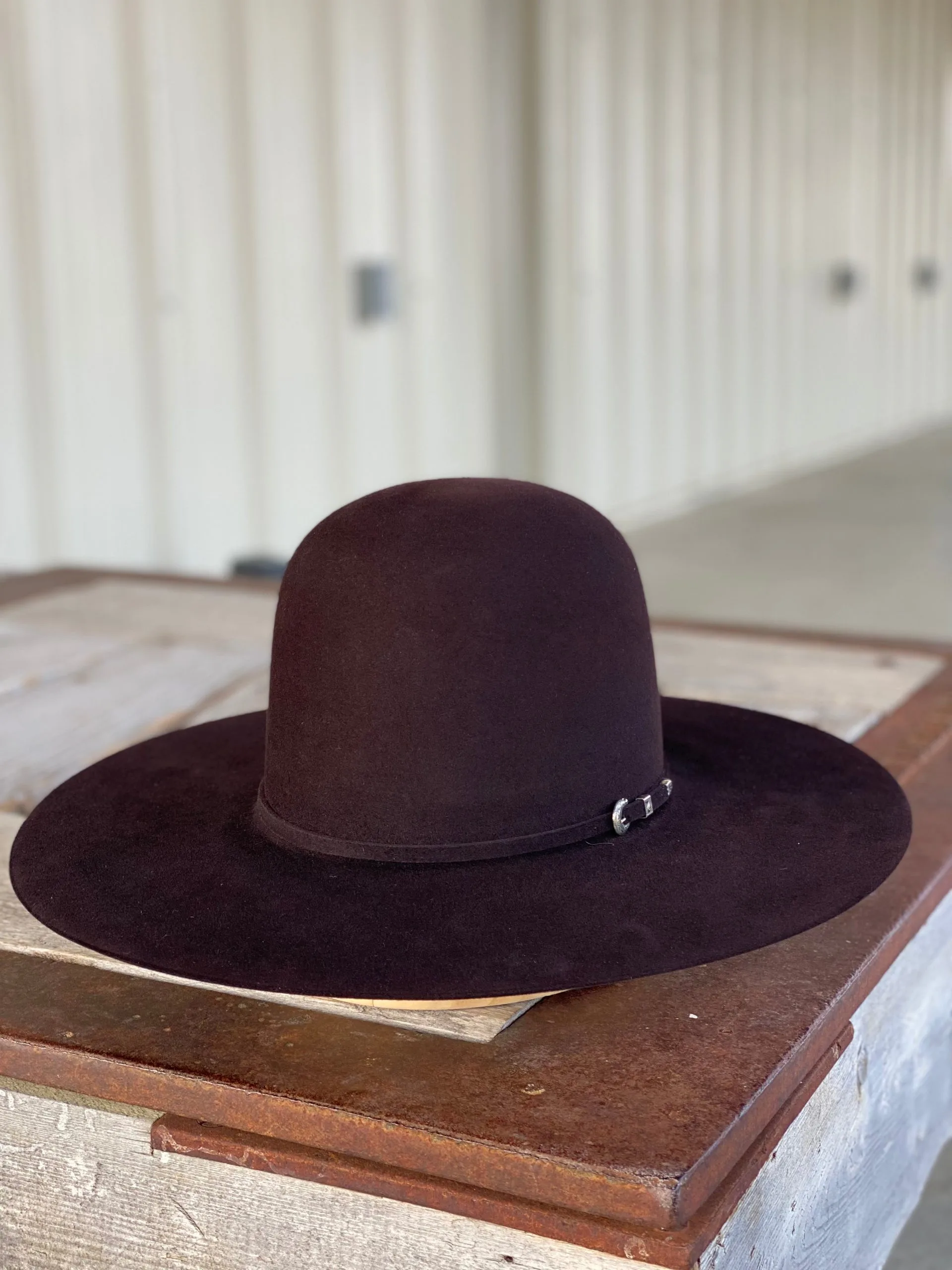 Rodeo King | Black Cherry 10X Felt Cowboy Hat | Crown: Open | Brim: 41/2″, Flat | Self band and buckle set | Long Oval | Genuine Leather Sweat Band |