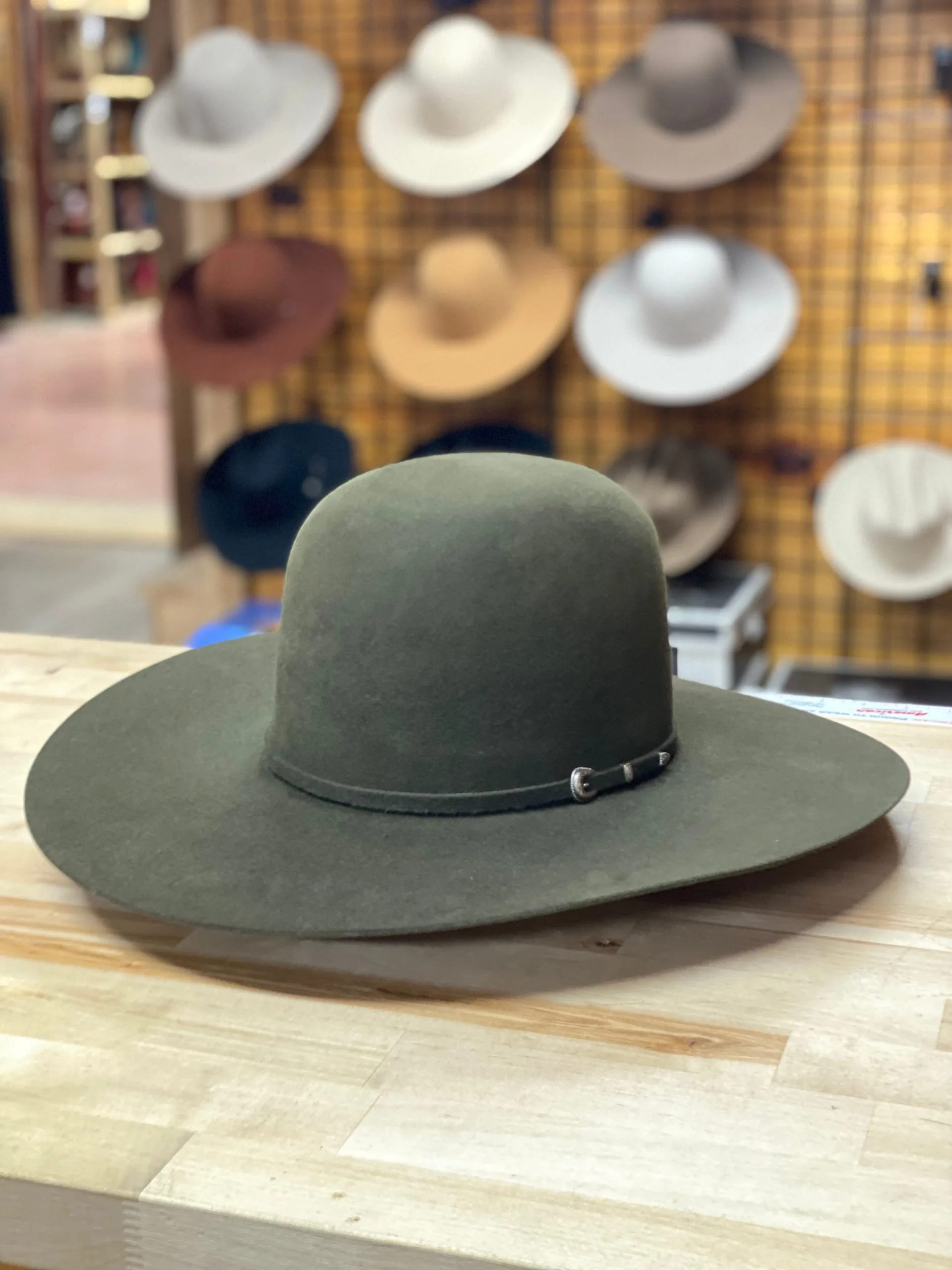 Rodeo King Moss Green 7x Felt Cowboy Hat | Crown: Open | Brim: 4 1/2″, Flat | Long Oval | Self band and buckle set | Genuine Leather Sweat Band |