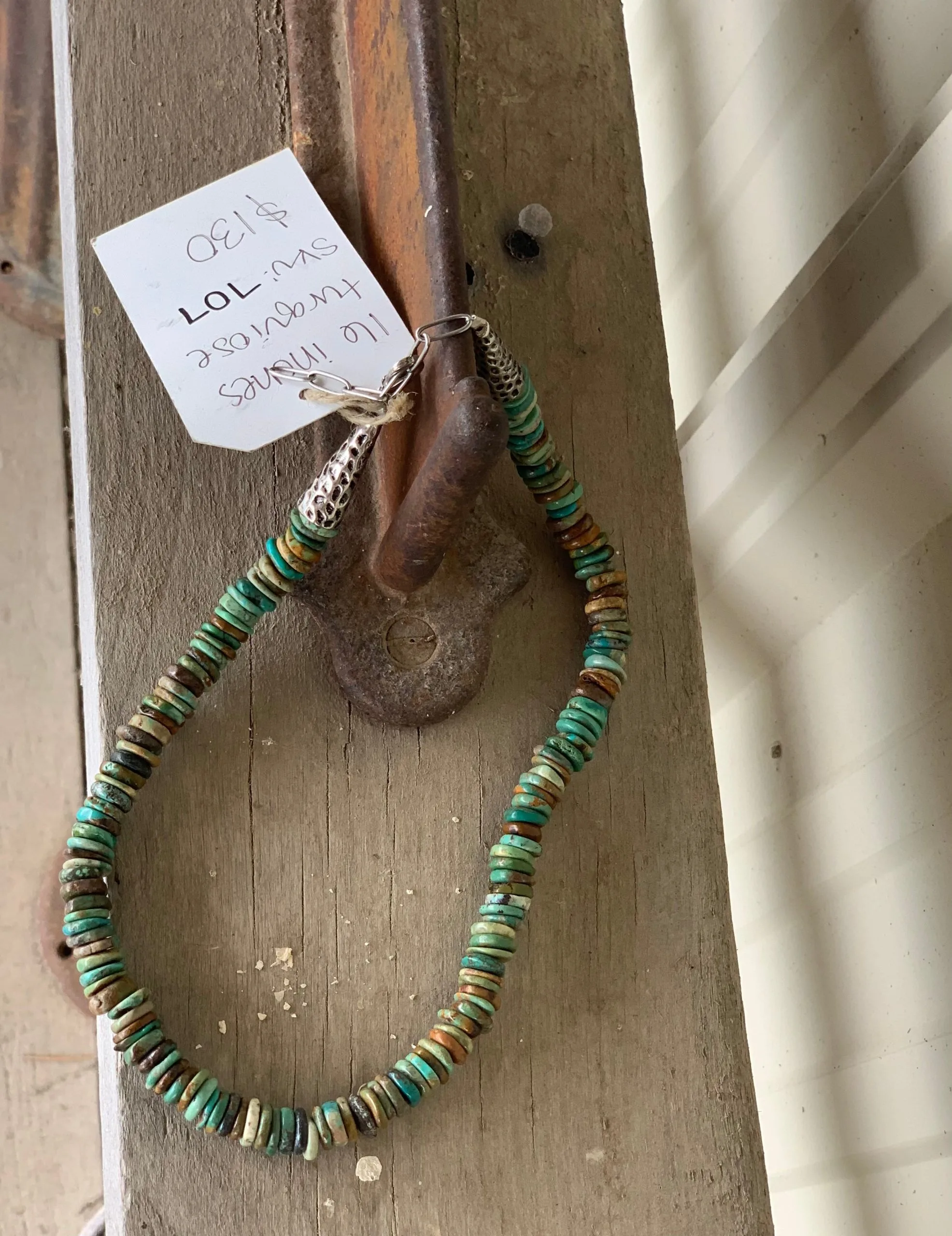 16” Natural Turquoise Disc Necklace. One of a kind, hand beaded, authentic stone jewelry, Made Kansas, USA