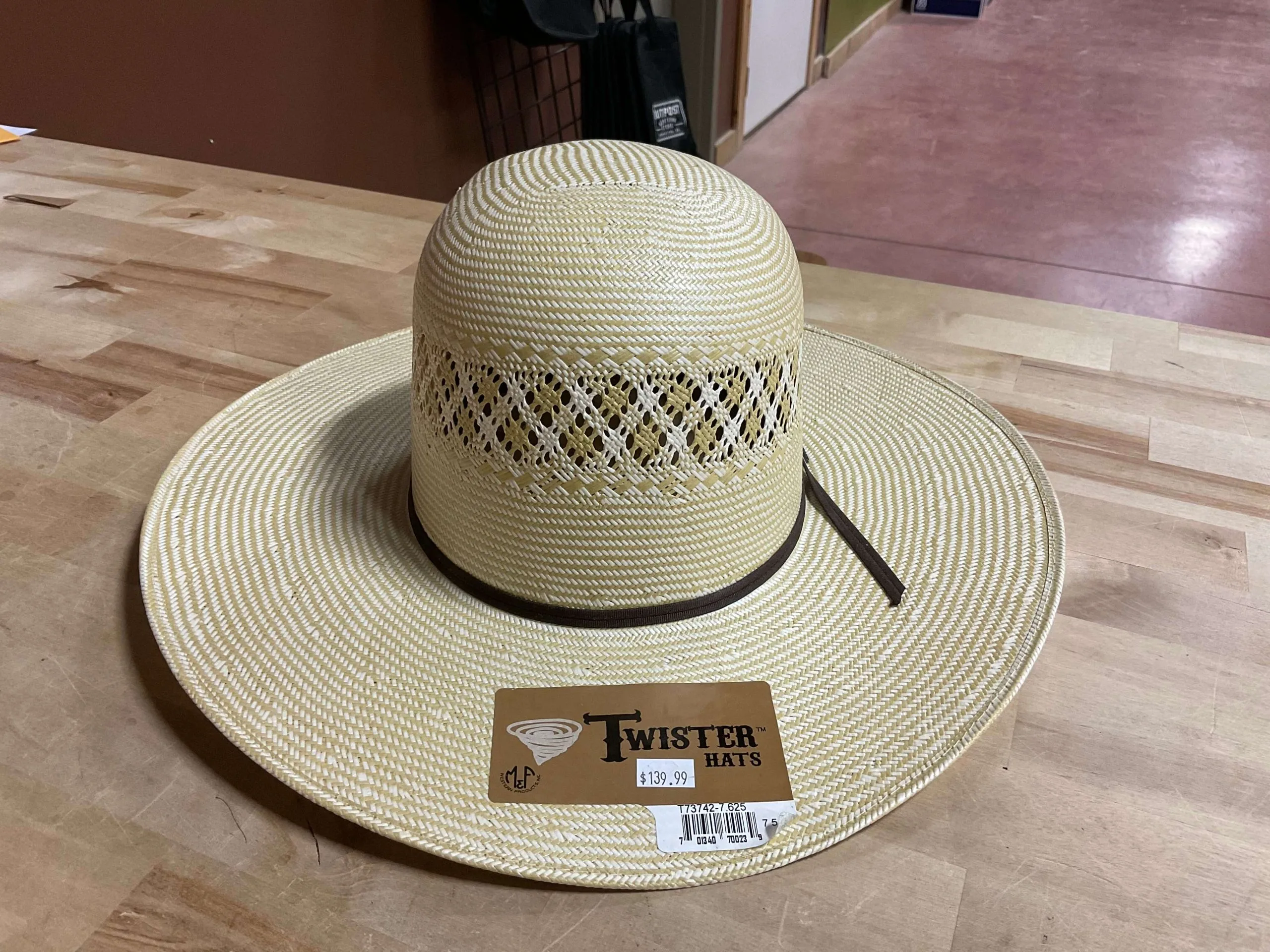 Twister Straw Cowboy Hat | Crown: Open | Brim: Flat 4 1/4 “ | Chocolate 2 Cord Ribbon Hat Band | Leather Sweat Band SKU: T73742 Color: Yellow/White